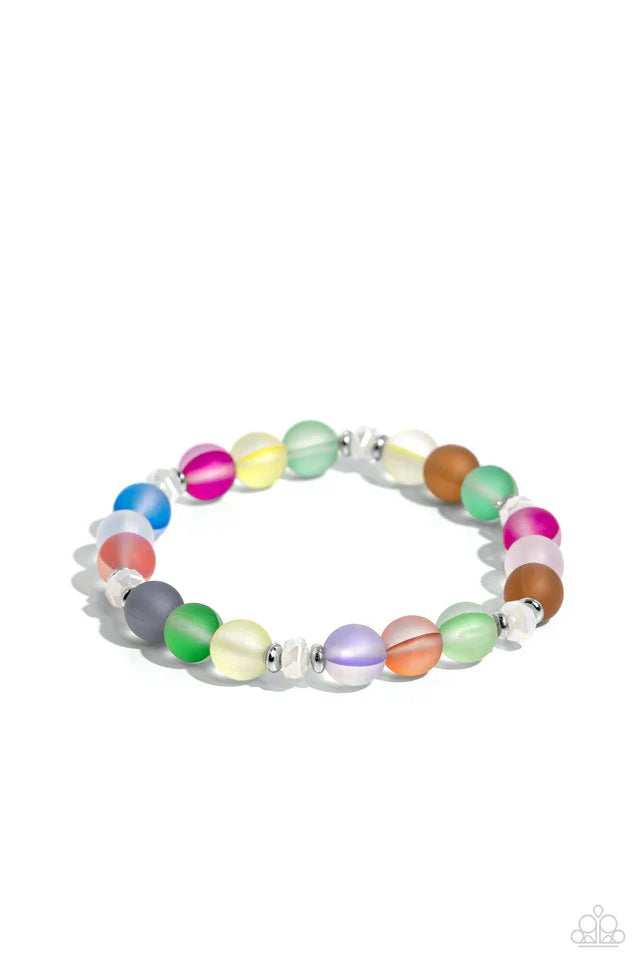 Infused with silver accents and faceted white beads, a dreamy collection of frosted glassy multicolored beads is threaded along a stretchy band around the wrist for an enchanting glow.