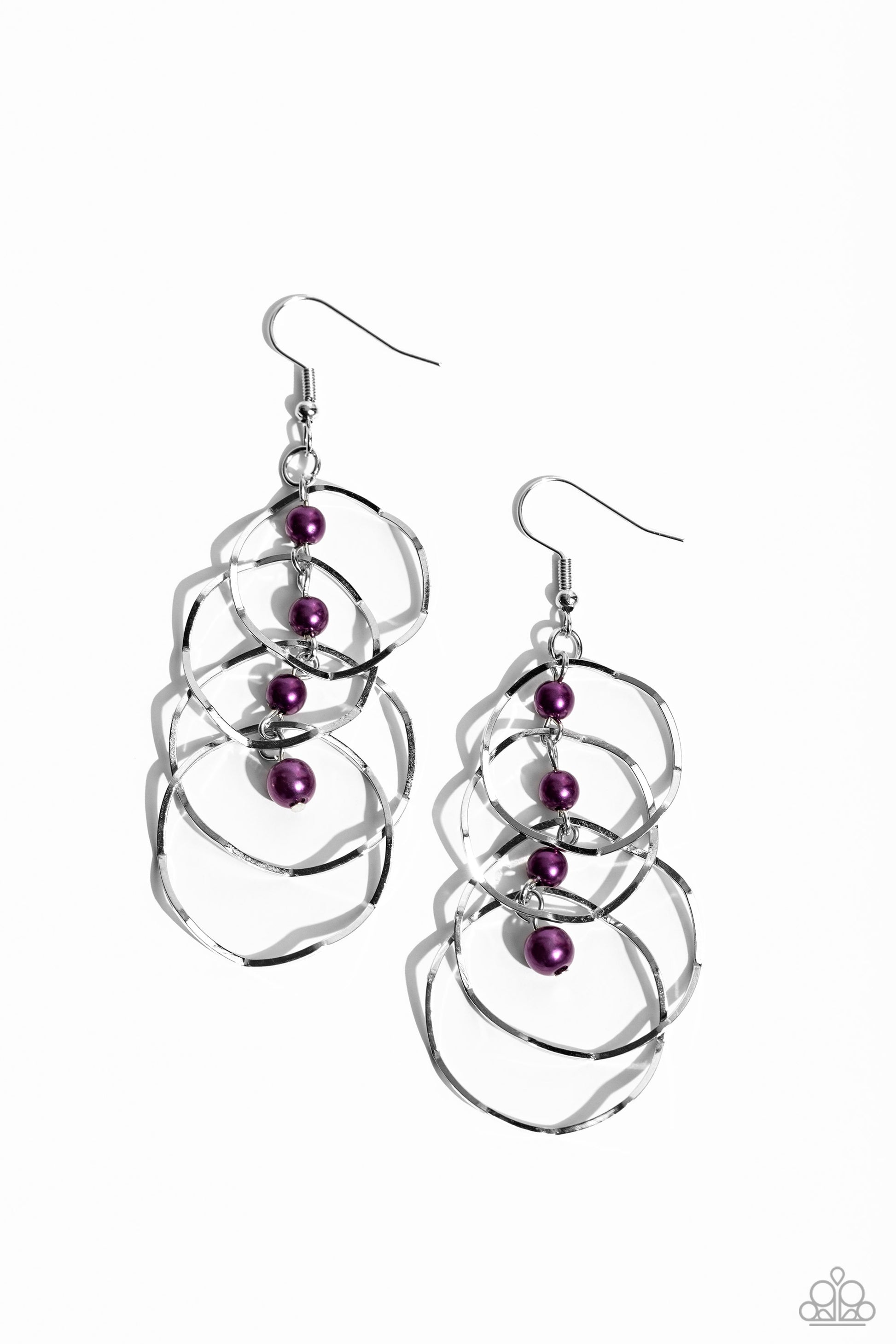 Zigzagging silver hoops trickle from a dainty strand of plum pearls, overlapping into a bubbly lure. Earring attaches to a standard fishhook fitting.
